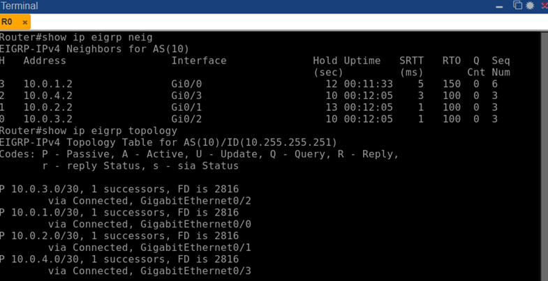 Для EIGRP настроен процесс router eigrp 10 (AS номер 10) на каждом маршрутизаторе. Все интерфейсы, подключенные к транзитным сетям 10.0.X.0/30, были включены в EIGRP командой network. Loopback-интерфейсы R1–R4 для простоты в EIGRP не анонсировались (чтобы исключить влияние лишних маршрутов; router-ID EIGRP не настолько критичен для установления соседства). Метрики EIGRP также использовались по умолчанию (на основе пропускной способности и задержки; все линки равны по параметрам, поэтому метрика между любыми двумя узлами через R0 была одинаковой). Функции EIGRP stub или широковещательных оптимизаций не применялись – топология небольшая, и все маршрутизаторы, кроме R0, граничат только с R0.