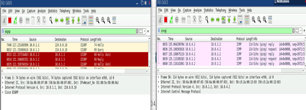 Рис. 12. Анализ трафика EIGRP (Hello, Query, Reply) и ICMP (Echo Request/Reply) в Wireshark