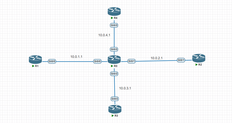 R0(центральный) | gig0/2 | 10.0.3.1 | /30 | Соединение с R3 |