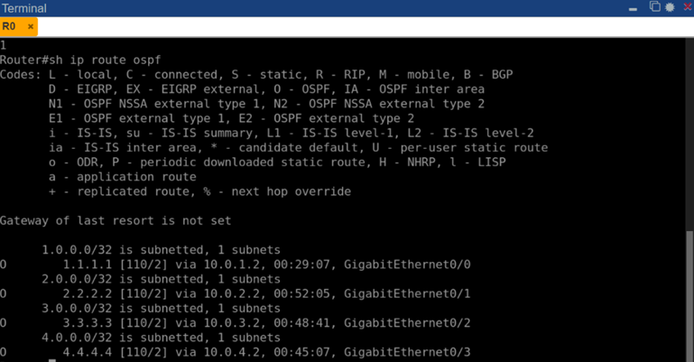 Рис. 3. Таблица маршрутов OSPF на маршрутизаторе R0 (вывод команды show ip route ospf)