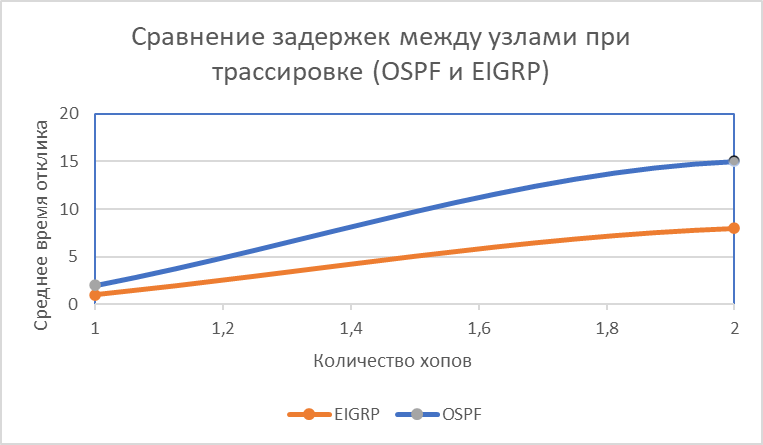 Таким образом, EIGRP рациональнее использовать в сетях с оборудованием Cisco, где важна скорость восстановления и простота конфигурации, тогда как OSPF остаётся универсальным стандартом для масштабных мультивендорных инфраструктур. Результаты эксперимента подтверждают выводы предыдущих исследований о преимуществе EIGRP по скорости сходимости и устойчивости к отказам.