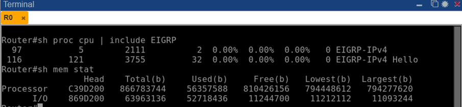 В нормальных условиях фоновые процессы EIGRP потребляли минимум ресурсов: show processes cpu / include EIGRP на R0 дал 0% использования CPU задачами EIGRP и Hello.