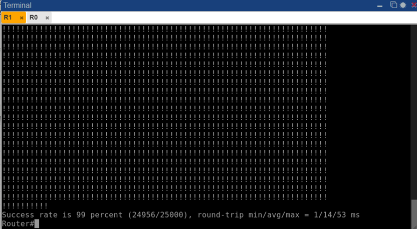 Рис. 14. Результат пинг-теста (25000 пакетов) с R1 до R4 через EIGRP