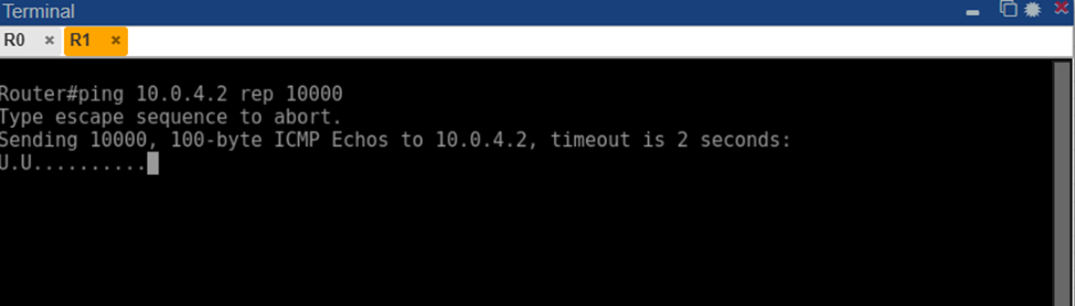 Со стороны пользователя отказ проявился как потеря доступности R4. Непрерывный пинг, запускавшийся с R1 на адрес 10.0.4.2, сначала выдавал стабильные ответы, но после отключения линка начали фиксироваться пропуски. На рисунке 3 показан фрагмент вывода команды ping на R1 в момент непосредственно после отказа: символы. обозначают отсутствие ответа на ICMP-запрос (таймаут), а символ U означает получение сообщения Destination Unreachable (источник – сам R1 либо R0 уведомил об отсутствии маршрута). Видно, что сразу после разрыва связи несколько пакетов не получили ответов, что соответствует периоду перестройки маршрутов.