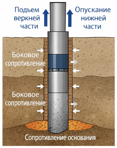 Двунаправленное статическое испытание сваи основано на использовании гидравлической ячейки, размещаемой внутри сваи, как правило, вблизи ее нижнего конца либо на заданной отметке по длине. При нагружении ячейка создает два равных по величине, но противоположно направленных усилия, в результате чего верхний сегмент сваи перемещается вверх, а нижний – вниз. Таким образом, сопротивление боковой поверхности и сопротивление основания сваи мобилизуются раздельно.
