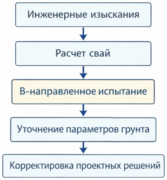 Таким образом, B-направленные испытания могут рассматриваться не только как средство контроля, но и как активный инструмент инженерного анализа, влияющий на выбор длины свай, их диаметра и расчетных коэффициентов запаса.