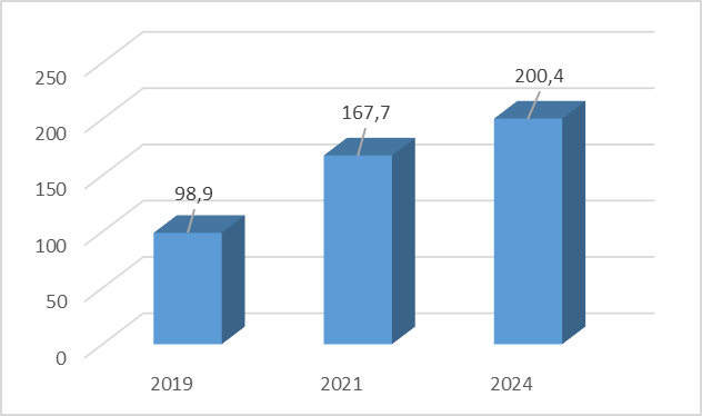 Анализ статистических данных свидетельствует о существенной роли доходов от использования имущества, находящегося в государственной и муниципальной собственности, в структуре неналоговых доходов местных бюджетов. Так, в 2019 году объем соответствующих поступлений составил 98,9 млрд руб., в 2021 году – 167,7 млрд руб., а к 2024 году достиг 200,4 млрд руб. (рис. 1) [6].