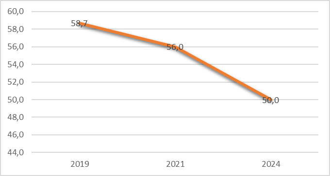 Вместе с тем, несмотря на рост абсолютных показателей, их удельный вес в структуре неналоговых доходов имеет тенденцию к снижению: с 58,7% в 2019 году до 56% в 2021 году и 50% в 2024 году (рис. 2) [6].