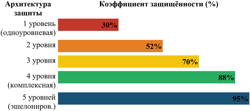 Предложенная методика проектирования КСЗ, основанная на принципах эшелонированной защиты и риск-ориентированном подходе, обеспечивает системный охват всех четырёх уровней – физического, технического, программного и организационного – с явной увязкой защитных мер с результатами анализа угроз и уязвимостей. Результаты практической апробации методики на примере промышленного предприятия нефтегазовой отрасли показывают, что применение четырёхуровневой интегрированной системы защиты повышает вероятность прерывания атаки с 30% (одноуровневая защита) до 88%, что подтверждает практическую значимость разработанного подхода.