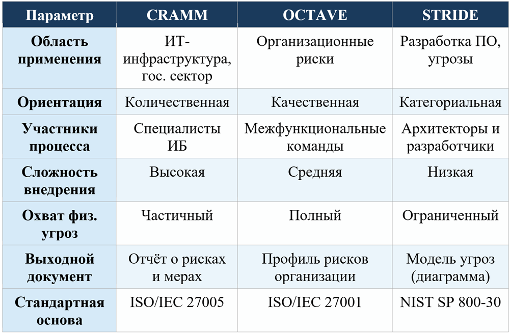 Среди наиболее распространённых в международной практике методологий анализа рисков выделяются три основных подхода. Методология CRAMM (CCTA Risk Analysis and Management Method) разработана британским правительством и представляет собой количественный метод оценки рисков, ориентированный преимущественно на информационные системы государственного сектора. OCTAVE (Operationally Critical Threat, Asset, and Vulnerability Evaluation) – качественная методология, разработанная в Институте программной инженерии Университета Карнеги-Меллон, направленная на самостоятельную оценку рисков организацией. STRIDE – методология моделирования угроз, разработанная компанией Microsoft, широко применяемая на этапе проектирования программных систем [8].