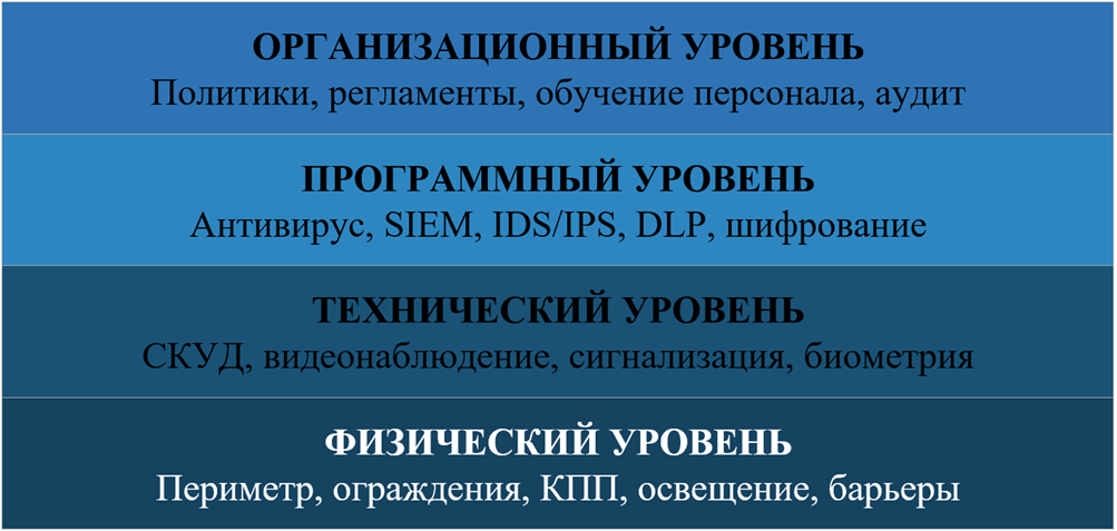 Концепция эшелонированной защиты (Defense in Depth) предполагает организацию нескольких последовательных рубежей безопасности, каждый из которых является независимым препятствием для реализации угроз. Согласно данной концепции, комплексная система защиты структурируется на четыре основных уровня: физический, технический, программный и организационный. Подобная многослойная архитектура обеспечивает избыточность защиты: компрометация одного уровня не приводит к полному провалу всей системы безопасности [3].