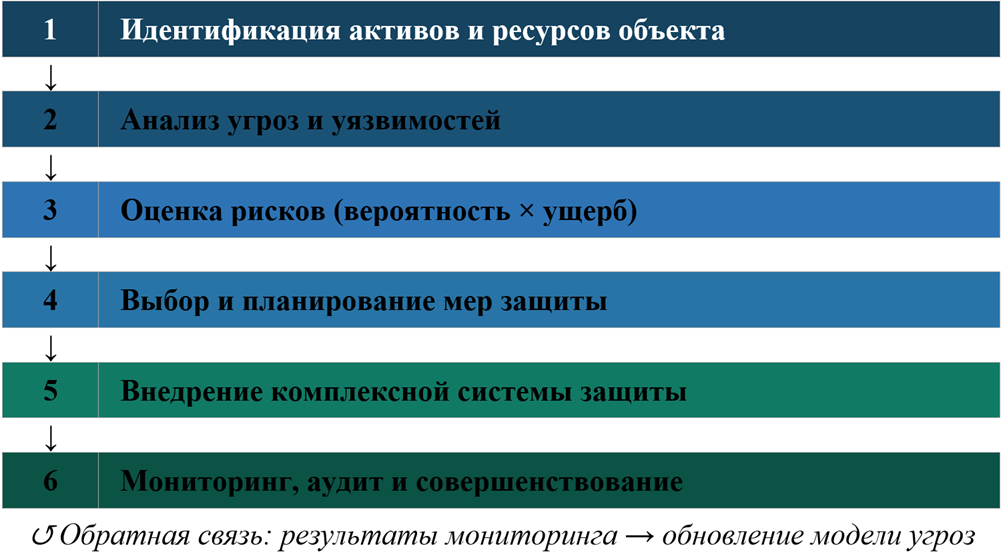 Процесс проектирования комплексной системы защиты неразрывно связан с методологически корректным анализом рисков. Анализ рисков позволяет перейти от интуитивного подхода к выбору защитных мер к обоснованному, приоритизированному плану защиты, в котором каждая мера соответствует конкретным угрозам и уязвимостям объекта [6].