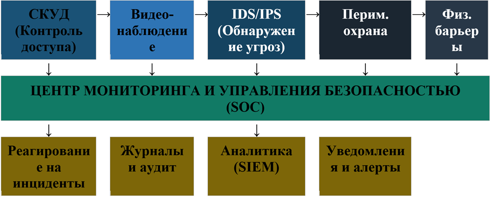 Проведённое исследование подтвердило, что обеспечение безопасности современных объектов требует комплексного, многоуровневого подхода, основанного на методологически корректном анализе рисков и интеграции разнородных подсистем безопасности в единую управляемую архитектуру. Фрагментарное применение отдельных средств защиты, не связанных в единую систему, формирует существенные уязвимости и не позволяет обеспечить достаточный уровень защищённости объекта.