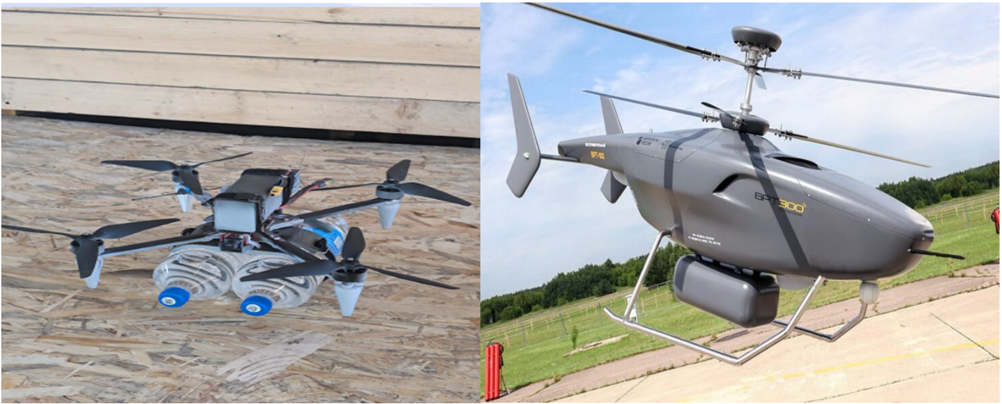 Рис. 1. Универсальная беспилотная система сброса и российский беспилотник вертолётного типа