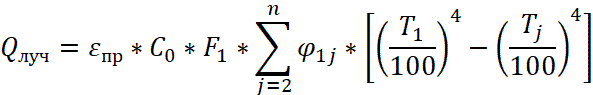 Общий лучистый поток от корпуса (индекс 1) ко всем ограждениям (индекс 2, 3, …) вычисляется как: