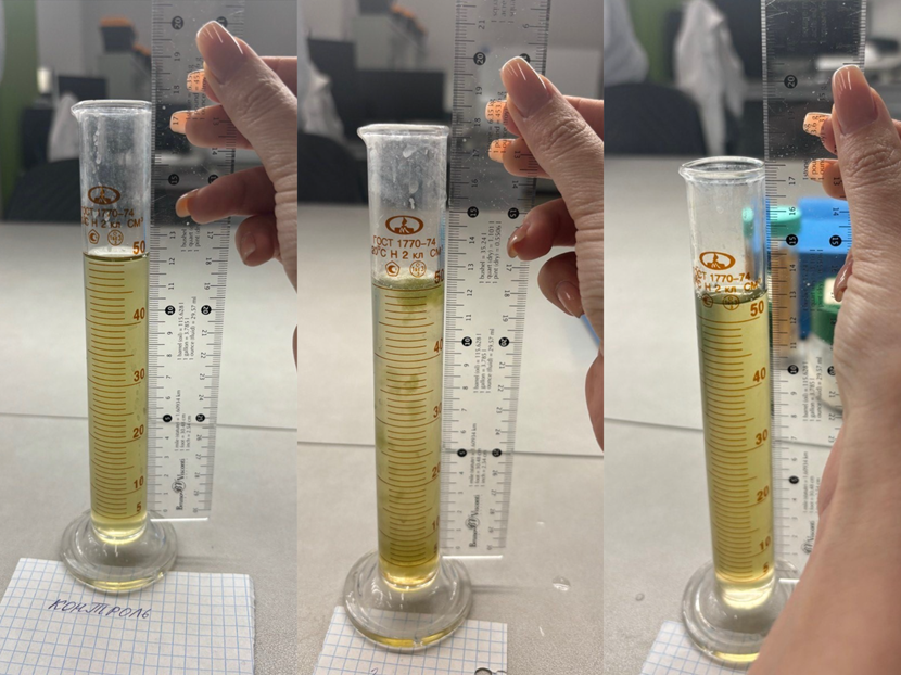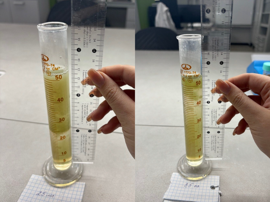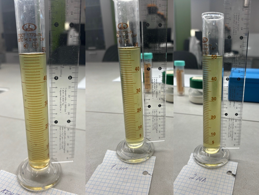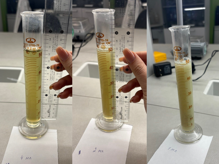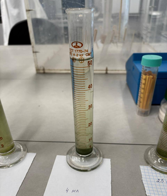 С целью определения оптимальной дозы реагента для эффективного осаждения фитопланктона был проведён повторный эксперимент. В ходе исследования тестировались следующие дозировки реагента: 1 мл, 2 мл, 2,5 мл, 3,5 мл и 4 мл. Каждая дозировка вводилась в отдельный цилиндр с идентичной исходной суспензией фитопланктона для обеспечения сопоставимости результатов.