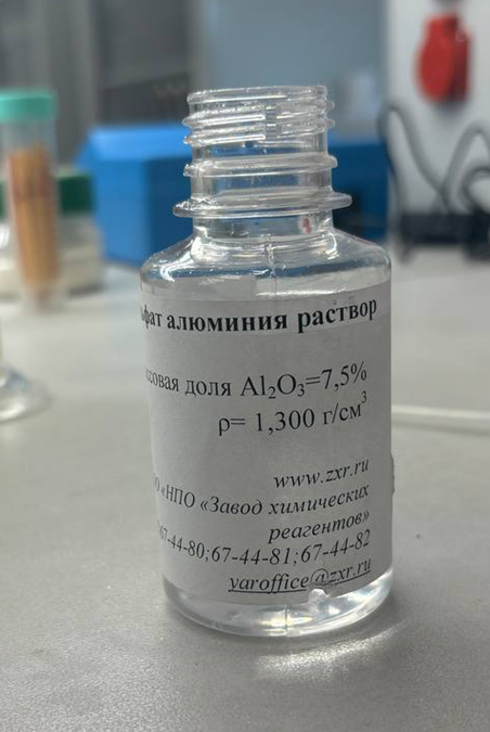 В качестве первого реагента был выбран раствор сульфата алюминия, массовая доля основного вещества Al2O3=7,5%, производитель ООО «НПО «Завод химических реагентов»» (рис. 2) [6].