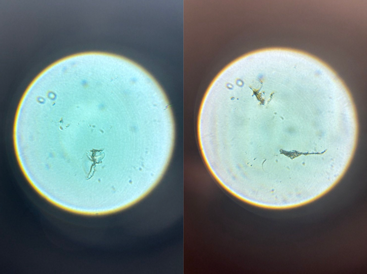 Для первого эксперимента с данным реагентом были использованы дозы в 3 и 5 мл на тот же объем фитопланктона – 50 мл. В результате через 30 минут в цилиндре с 3 мл образовались хлопья (рис. 5), которые были рассмотрены более детально под микроскопом (рис. 6). В случае с 5 мл никакой реакции не произошло, из чего был сделан вывод, что такая концентрация вещества – избыточна при решении задачи очистки воды от фитопланктона.