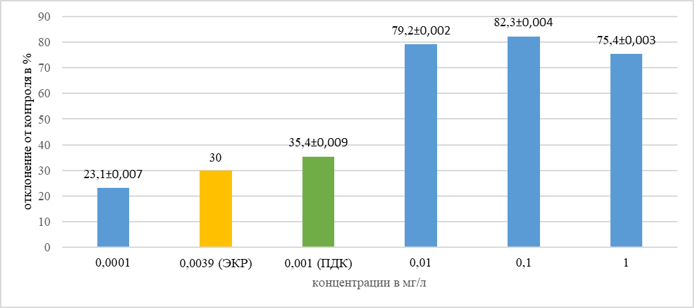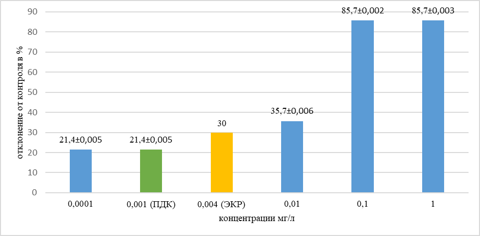 При концентрации, соответствующей ПДК для рыбохозяйственных водоемов по меди (0,001мг/л) был зафиксирован токсический эффект, отклонение от контроля составило 21,4 процента.