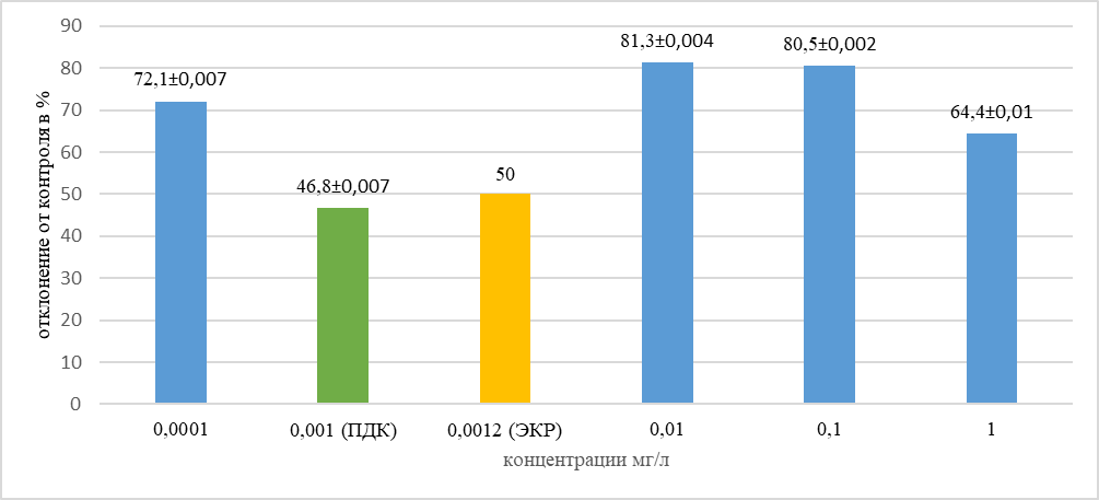 При концентрации, соответствующей ПДКр.х по меди (0,001 мг/л) был зафиксирован токсический эффект, отклонение от контроля составило 46,85 процента. В остальных концентрациях отклонение от контроля составило 64 и более процентов. По полученным данным рассчитали ЭКР50, который равен 0,0012 мг/л.