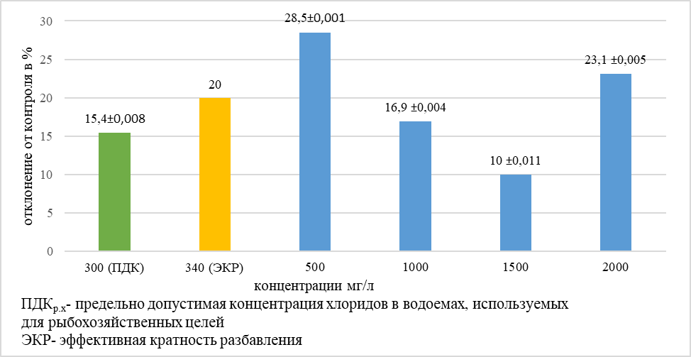 Из представленных данных видно, что при концентрации, соответствующей ПДКр.х для хлоридов (300 мг/л) отсутствует токсический эффект, тестируемая проба не оказывает острого токсического действия. В концентрациях 500 и 2000 мг/л мы наблюдаем токсический эффект (угнетение роста на 28,5 и 23,1 процента соответственно). При концентрации токсиканта 340 мг/л происходит подавление роста культуры микроводоросли Chlorella vulgaris на 20 процентов по сравнению с контролем.