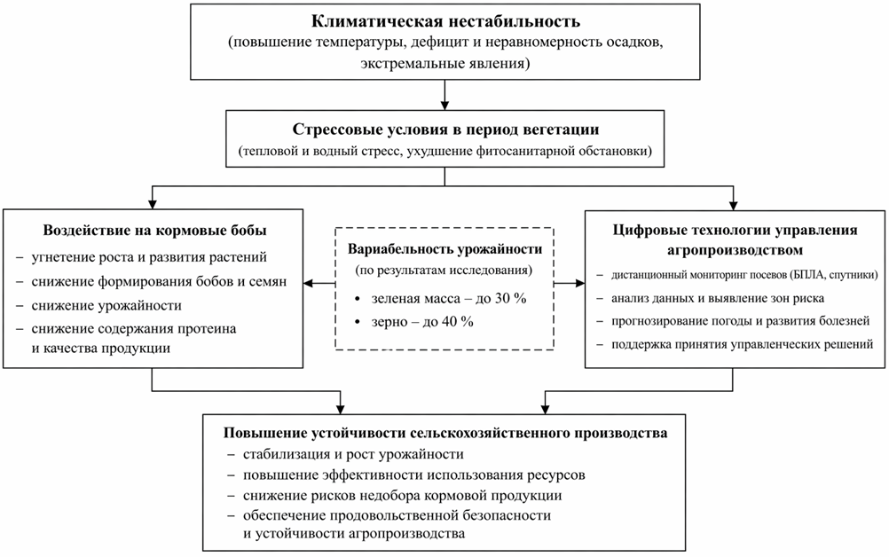 Рис. Схема взаимосвязи климатических факторов, вариабельности урожайности кормовых бобов и роли цифровых технологий в обеспечении устойчивости сельскохозяйственного производства