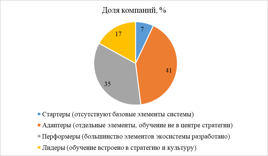 Как видно из диаграммы, лишь около одной шестой части компаний можно отнести к лидерам, в которых обучение рассматривается как ключевой фактор устойчивого развития персонала и бизнеса. Для большинства организаций вопрос построения целостной образовательной экосистемы остается задачей развития. Это усиливает актуальность теоретико-методологической разработки понятия корпоративной образовательной экосистемы, ее структуры и инструментов оценки эффективности.