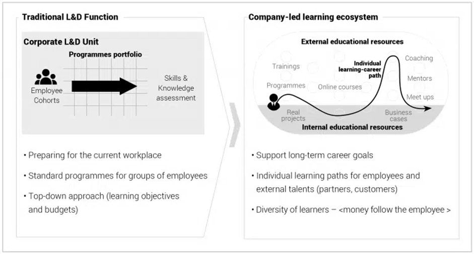 Рис. 1. Переход от традиционной функции обучения и развития персонала (L&D) к корпоративной образовательной экосистеме, управляемой компанией (company-led learning ecosystem) [2]