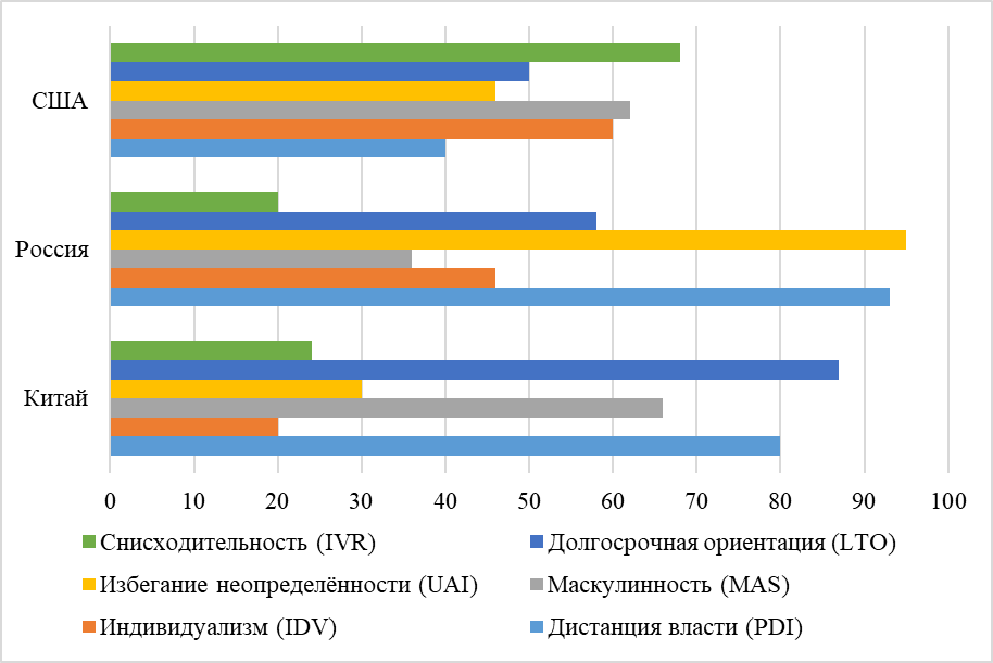 Для более системного сравнения культур в организационных исследованиях широко используется модель Г. Хофстеде, описывающая культурные измерения (дистанция власти, индивидуализм/коллективизм, ориентация на достижения, избегание неопределённости, долгосрочная ориентация, снисходительность/сдержанность). На практике такие измерения полезны не как «ярлыки», а как способ заранее увидеть зоны риска: например, различия по дистанции власти и избеганию неопределённости часто отражаются в том, насколько сотрудники ожидают детальных правил, как воспринимают обратную связь и как работают с изменениями. На рисунке 2 приведены значения по шести измерениям (0–100) для Китая, России и США из открытых профилей.