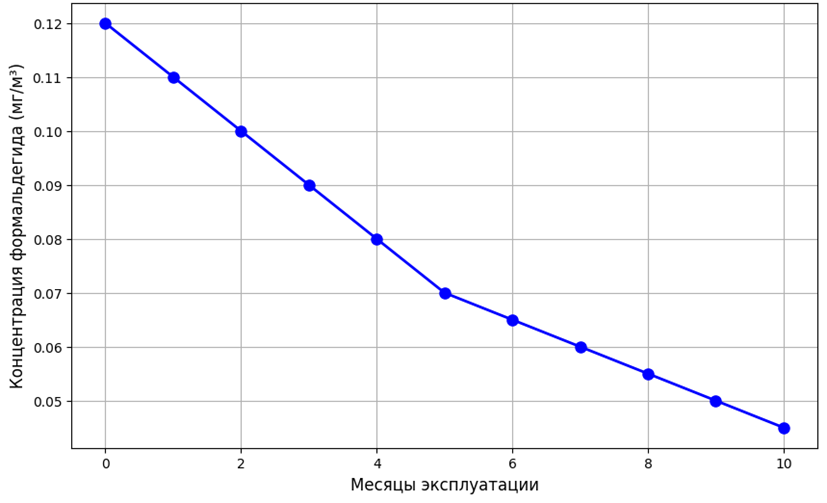 Рисунок ниже иллюстрирует общий характер эмиссии формальдегида с постепенным снижением уровня через первые месяцы эксплуатации изделия в контрольной камере.