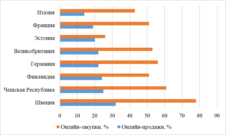 Рис. 2. Использование интернета для онлайн-продаж и онлайн-закупок по странам [7]