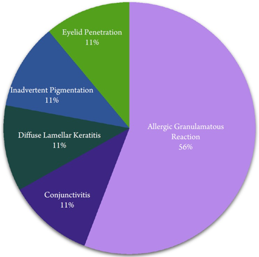 Диаграмма показывает преобладание аллергических поражений век среди описанных случаев, это подтверждает первостепенное значение правильной работы с клеем и расходниками, контактирующими с кожей и слизистой).