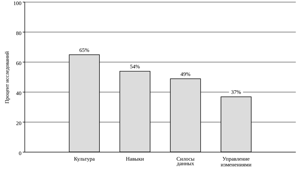 Представленная модель (рис. 1) фиксирует переход от разовых, фрагментарных обновлений к непрерывно функционирующему контуру технологической трансформации. В рамках такой логики искусственный интеллект выполняет уже не вспомогательную, а процессуально значимую функцию: его роль не ограничивается аналитической обработкой данных, поскольку он включается в саму структуру разработки, обеспечивая автоматизированную генерацию тестов и оперативную верификацию соответствия программного кода требованиям безопасности в режиме реального времени. Подобная конфигурация позволяет рассматривать модернизацию не как совокупность отдельных технических вмешательств, а как устойчивый и самоподдерживающийся процесс адаптации программной среды к новым эксплуатационным и нормативным условиям. Вместе с тем, несмотря на очевидные технологические преимущества, модернизационные процессы сопровождаются существенными затруднениями. Анализ академических публикаций за 2020–2023 гг. показывает, что барьеры цифровой трансформации сосредоточены преимущественно не в технической, а в организационной плоскости (рис. 2).