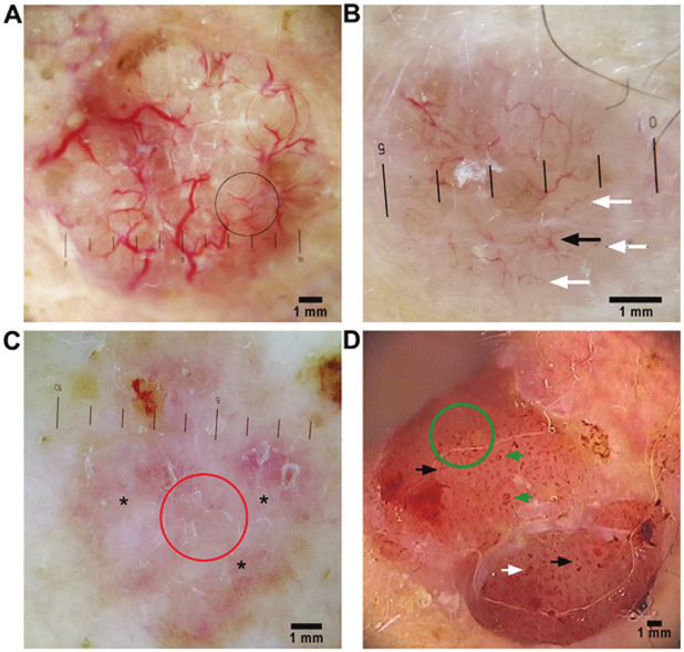 На дерматоскопических изображениях представлены типичные сосудистые структуры и воспалительные изменения, которые используются в предиктивной диагностике для оценки риска осложнений перед косметологическими процедурами (рис. 2). На панели A визуализируются разветвлённые телеангиэктазии, свидетельствующие о высокой сосудистой реактивности кожи и повышенной вероятности постпроцедурной эритемы. Панель B демонстрирует комбинацию поверхностных и глубоких сосудистых структур, что характерно для кожи с нестабильной микроциркуляцией и потенциальной склонностью к появлению гематом при инъекционных методиках. На панели C отмечаются зоны субклинического воспаления и нарушения барьерной функции (обозначены звёздочками), которые увеличивают риск раздражения и пролонгированного восстановления после химических пилингов. Панель D отражает участки выраженной васкуляризации (зелёный контур) и микро-геморрагии (чёрные стрелки), являющиеся предикторами неблагоприятной реакции при процедурах, связанных с тепловым воздействием.
