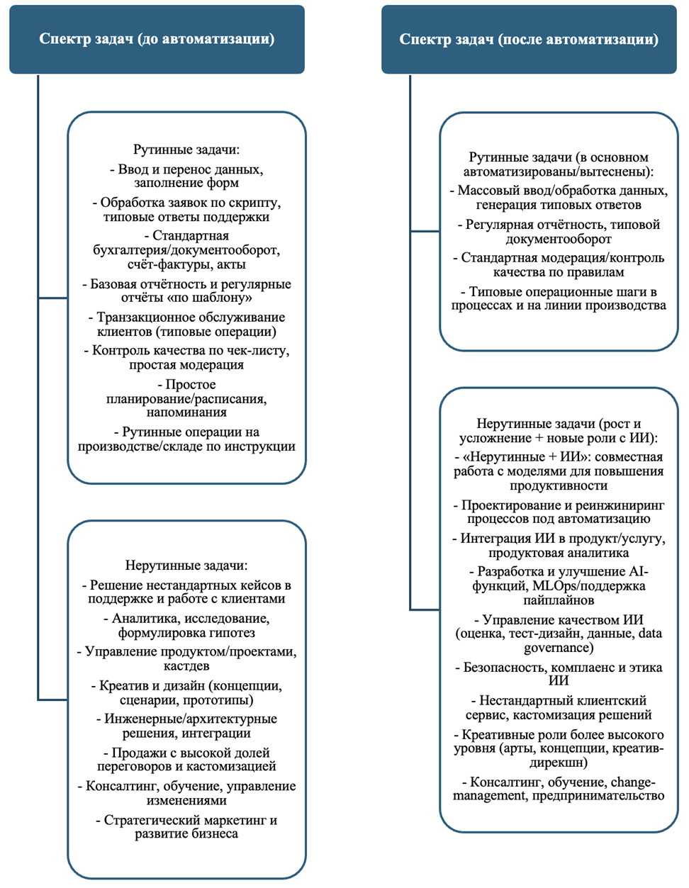 Для адекватного понимания влияния технологий на рынок труда необходимо отказаться от упрощенного представления об «уничтожении рабочих мест». Теоретическая модель, предложенная Асемоглу Д., Рестрепо П. в работе 2022 года, предлагает более тонкий анализ, основанный на концепции «вытеснения задач» [9, с. 1973-2016]. Согласно их исследованию, от 50% до 70% изменений в структуре заработной платы в США за последние четыре десятилетия объясняются относительным снижением доходов тех групп работников, которые специализировались на выполнении рутинных задач в отраслях, подвергшихся быстрой автоматизации [9, с. 1973-2016].