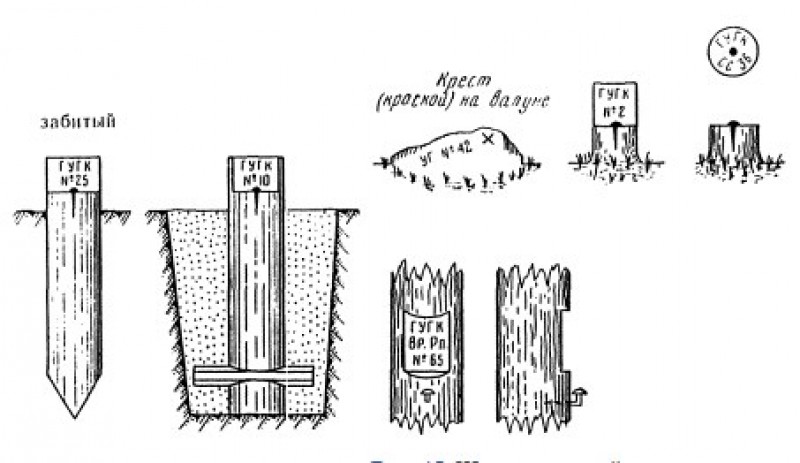 Вообще, первые знаки (реперы) выглядели так. Деревянные колышки, вырезанные с надписями, вбитые в землю.