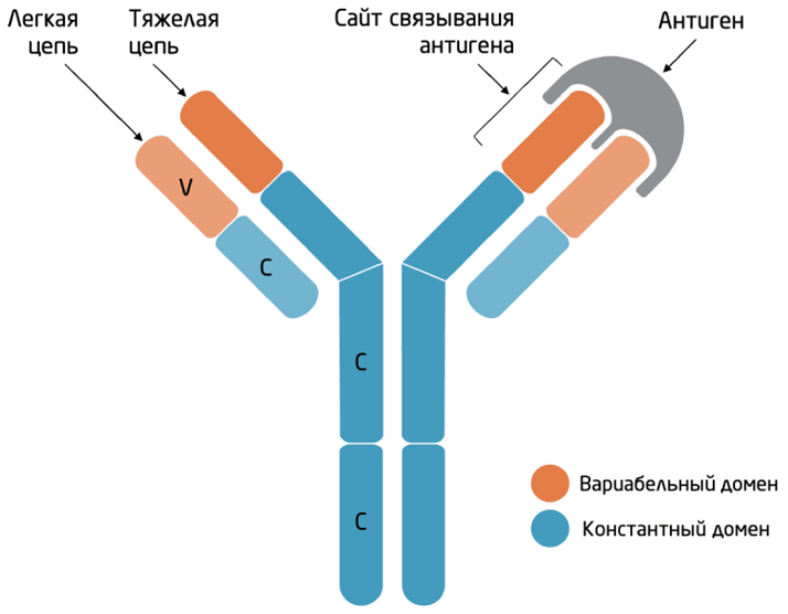Рис. 1. Схема строения иммуноглобулина: вариабельные и константные домены, тяжелые и легкие цепи, участок связывания антигена [1]
